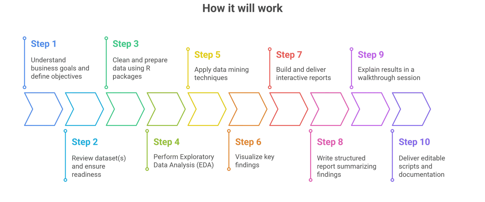I turn large, messy datasets into clear insights using R. Whether it's trend discovery, segmentation, or predictive modeling, I use the full power of R—from tidyverse to machine learning libraries—to answer real business or research questions. My reports are built to inform decisions, not just fill pages.